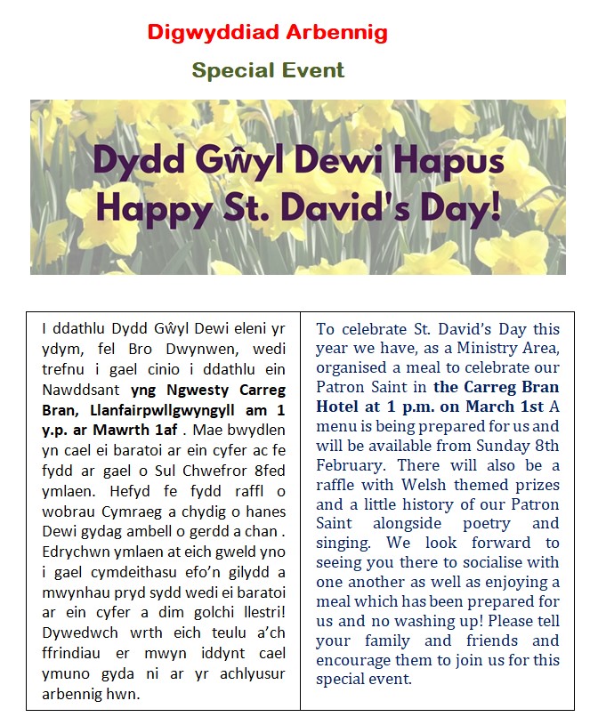 Roedd aelodau ar draws Bro Dwynwen yn bresennol ac yn ystod yr un gwasanaeth trwyddedwyd hefyd ein Darllenydd Lleyg, Joan Hardie, a Wardeiniaid yr amrywiol eglwysi yn y Fro.